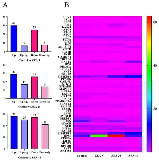 The histogram (A) and heatmap analysis (B) of zearalenone on AMPK/mTOR pathway-related genes in porcine endometrial epithelial cells. Control, ZEA 5, ZEA 20, and ZEA 40 were porcine endometrial epithelial cells (PECs) exposed to ZEA at 0, 5, 20, and 40 μmol/L for 24 h. Up-sig., significantly upregulated (p < 0.05). Down-sig., significantly down-regulated (p < 0.05).