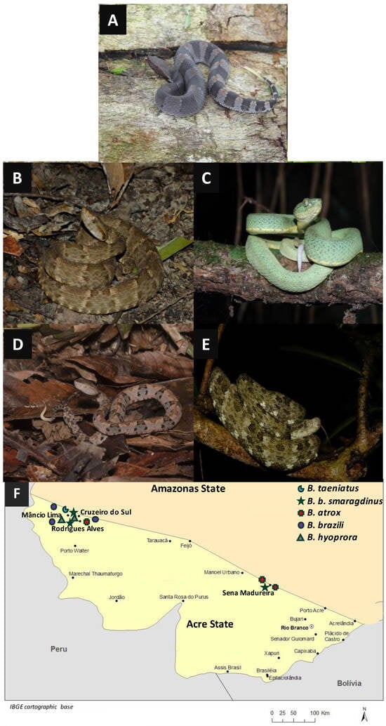 To examine the venom composition of snakes, we selected two specimens of Bothrocophias hyoprora, three specimens of B. b. smaragdinus, three specimens of B. brazili, three specimens of B. atrox, and one specimen of B. taeniatus, illustrated in Figure 1A–E, collected in the Acre State of Brazil, mostly in the Alto Juruá region (Figure 1F).