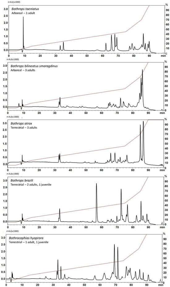 Figure 2. Comparison of the chromatographic profiles of venom samples from B. taeniatus; B. bilineatus smaragdinus; B. atrox; B. brazili; and Bothrocophyas hyoprora: Individual venom samples (2 mg) were applied to a C-18 column. Mobile phases used were 0.1% TFA in water (solution A) or 0.1% TFA in acetonitrile (solution B). Proteins were gradient eluted at 2 mL/min as depicted by the red line. Separation was monitored at 214 nm.