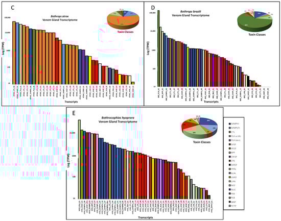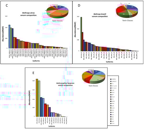 Figure 3. Venom gland transcriptomes: B. taeniatus (A); B. bilineatus smaragdinus (B); B. atrox (C); B. brazili (D); and Bothrocophyas hyoprora (E). Bar plots and pie charts represent the average venom composition of each species classified by toxin class.