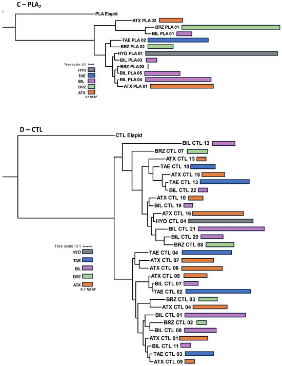 Figure 5. Phylogenetic inferences of isoforms from the most abundant toxin groups: Complete deduced protein sequences of SVMPs (A), SVSPs (B), PLA2s (C), and CTL (D) were aligned using MAFF-T. The maximum likelihood phylogenetic tree was generated using PhyML. Bars represent the quantitative value (NSAF) of the isoforms detected via LC-MS/MS in each venom sample, which are represented by the different colors of the bars, as indicated in the figure.