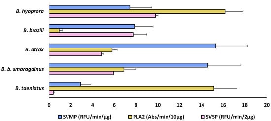 Figure 6. Enzymatic activities of B. taeniatus, B. bilineatus smaragdinus, B. atrox, B. brazili, and Bothrocophyas hyoprora venoms: SVMP catalytic activity was evaluated via hydrolysis of a FRET substrate (Abz-AGLA-EDDnp), and results are expressed as RFU/min/µg of venom. SVSP catalytic activity was evaluated via hydrolysis of the chromogenic synthetic substrate (L-BAPNA) and expressed in Abs/min/2 µg of venom. PLA2 activity was evaluated via hydrolysis of the chromogenic substrate (NOBA) and the results are expressed in Abs/min/10 µg of venom. The data shown represent the mean + SD of three independent experiments.