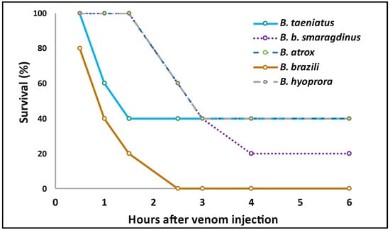 Figure 7. Lethality of B. taeniatus, B. bilineatus smaragdinus, B. atrox, B. brazili, and Bothrocophyas hyoprora venoms in murine models: Single doses of venom (300 μg) were injected i.p. into groups of five mice. Next, the deaths were followed up every hour until 6 h after, then at 12, 24, and 48 h after venom injection. The graphic shows the X axis only up to 6 h, as no death was recorded after this time.