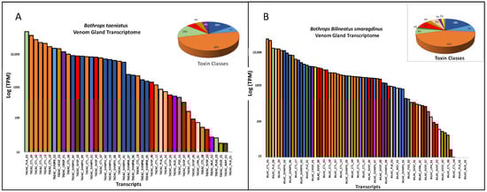 Venom gland transcriptomes: B. taeniatus (A); B. bilineatus smaragdinus (B); B. atrox (C); B. brazili (D); and Bothrocophyas hyoprora (E). Bar plots and pie charts represent the average venom composition of each species classified by toxin class.