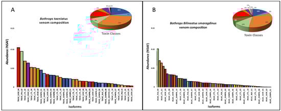 The presence and abundance of different isoforms result in the overall biological effects of the venoms. Indeed, in Figure 6, we show a comparison of the enzymatic activities of each pool of venom. SVMP activity varied among the venoms and was highest in the venoms of B. atrox and B. b. smaragdinus (Figure 6, blue bars), which could be explained by the presence of ATXSVMPIII-04 and BILSVMPIII-10 isoforms amongst the most expressed SVMPs of B. atrox and B. b. smaragdinus, respectively. These two isoforms present similar primary structures sharing more than 90% identity with Jararhagin and Batroxrhagin [48], known to be multifunctional hemorrhagic metalloproteinases, conserved in venoms of several species of vipers [31]. B. hyoprora and B. taeniatus presented the highest PLA2 activity (Figure 7, yellow bars), probably due to the high catalytic activity of acidic PLA2, dominant in both venoms. In opposition, B. brazili venom presented the highest content of PLA2 isoforms but a very low catalytic activity, which could be attributed to the lack of catalytic activity in the K49-PLA2 homologs abundant in this venom [49]. Considering SVSPs, B. brazili venom contained a high catalytic activity, which agrees with the highest abundance of SVSPs in the venom proteome. However, B. hyoprora had the lowest proportion of SVSPs in the venom proteome but presented the highest activity indicating a high specific activity of the single isoform expressed in the venom. Interestingly, B. taeniatus venom contained a very low catalytic SVSP activity, which agrees with the lack of procoagulant [50] or defibrinating [51] activities previously reported for this venom.