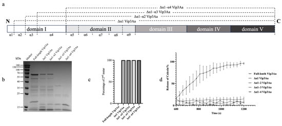 Proteolytic stability and activity assays of four Vip3Aa truncations. Panel (a): Schematic presentation of four N-terminal truncations of Vip3Aa proteins. Four N-terminal truncations of Vip3Aa were prepared by truncation of helix α1, helix α1 and α2, helix α1–α3, and helix α1–α4. Panel (b): SDS-PAGE analysis of four Vip3Aa truncations after tryptic processing at a ratio of 1.2:1 (trypsin–Vip3Aa, w/w) at 37 °C for 1 h. Panel (c): Neonates of S. Litura were fed with 100 μg/mL of N-terminal truncations of Vip3Aa and the full-length Vip3Aa, respectively, by surface overlay bioassays. Numbers of larvae developed to the second instar were recorded after 72 h. Panel (d): Calcein release assays by treating liposomes with 16 nM of four N-terminal truncations of Vip3Aa after tryptic processing. Fluorescence signals of released calcein were recorded every 30 s. The error bars represent the standard error of mean of the measurements from triplicate experiments.
