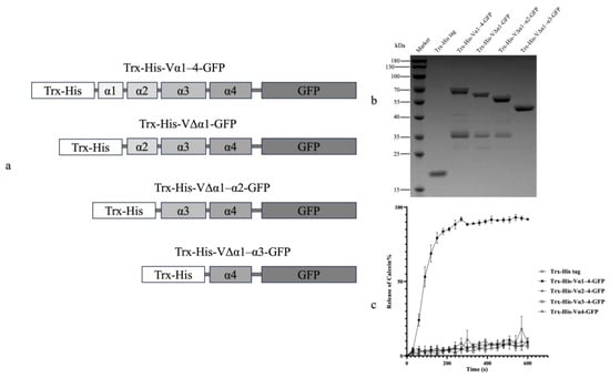 To investigate whether the Vip3Aa domain I could independently permeabilize liposome membranes, the Vip3Aa domain I and its N-terminal truncations were fused with a GFP, respectively, creating four Vip3Aa-GFP combinations (Figure 2a). SDS-PAGE analysis indicated that the molecular weights of the four combinations were consistent with the expected sizes from 65 kDa to 49 kDa (Figure 2b). Calcein release assays were then used to assess their liposome permeation activity. Only the Trx-His-Vα1–4-GFP (containing the full-length domain I) displayed significant liposome permeabilization, in which calcein leakage began at 20 s and reached over 90% by 270 s (Figure 2c). None of the other fusion proteins carrying N-terminal truncations of the Vip3Aa domain I exhibited any detectable calcein release.