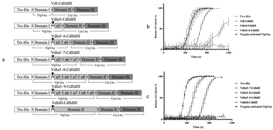 Calcein release assays by treating liposomes with Vip3Aa-Cry1Ac fusion proteins. Domain I and domain II extensions of Vip3Aa were fused with a Trx-His tag and domains II and III of Cry1Ac to produce seven Vip3Aa-Cry1Ac recombinant proteins. The trypsin cleavage site between domain I and II of Vip3Aa is presented by a triangle. Liposome (DOPC–DOPE, 1:1) permeability of seven Vip3Aa-Cry1Ac fusion proteins was determined through calcein release assays. The final concentration of each assayed protein was 10 μM/mL. Fluorescence signals of released calcein were recorded every 30 s. The error bars represent the standard error of mean of the measurements from triplicate experiments. Trx-His tag and trypsin-activated Vip3Aa were used as the negative control and the positive control, respectively. Panel (a): schematic presentation of seven Vip3Aa-Cry1Ac recombinant proteins. Panel (b): calcein release rate of recombinant proteins, including VdI-CdIIdIII, VdIα5-CdIIdIII, and VdIα5–6-CdIIdIII. Panel (c): calcein release rate of recombinant proteins, including VdIα5–7-CdIIdIII, VdIα5–8-CdIIdIII, VdIα5–9-CdIIdIII, and VdIdII-CdIIdIII.