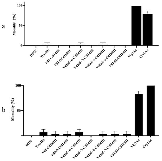 Seven recombinant proteins were generated by fusing N-terminal fragments of Vip3Aa (domain I and II) with domains II and III of Cry1Ac. These recombinants contained the Vip3Aa domain I and additional α-helices from domain II, as shown in Figure 3a. The calcein release assays revealed that five of the seven recombinants exhibited liposome permeability, while VdIα5–7-CdIIdIII and VdIdII-CdIIdIII did not (Figure 3b,c). The liposomes treated with VdI-CdIIdIII began leaking calcein within 400 s, reaching 100% leakage by 680 s. Interestingly, the calcein release curve for the VdI-CdIIdIII-treated liposomes closely resembled that of the liposomes treated with trypsin-activated Vip3Aa. While VdI-CdIIdIII and trypsin-activated Vip3Aa exhibited similar potencies, the other permeable fusion proteins (VdIα5-CdIIdIII, VdIα5–6-CdIIdIII, VdIα5–8-CdIIdIII, and VdIα5–9-CdIIdIII) displayed lower calcein release rates. Despite their membrane permeation activity, none of the seven Vip3Aa-Cry1Ac fusions exhibited insecticidal activity against S. litura or P. xylostella larvae. Feeding larvae with these fusion proteins resulted in nearly no mortality, while Vip3Aa and Cry1Ac individually caused 100% and 75% mortality in S. litura (Figure 4a) and 97% and 100% mortality in P. xylostella (Figure 4b), respectively.