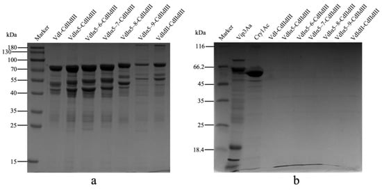 Proteolytic stability of seven Vip3Aa-Cry1Ac recombinant proteins. Panel (a): Seven Vip3Aa-Cry1Ac recombinant proteins were incubated at 30 °C for 6 h without any proteases and loaded to a 15% SDS-PAGE gel, respectively. Panel (b): seven Vip3Aa-Cry1Ac recombinant proteins, the full-length Vip3Aa, and Cry1Ac protoxins were incubated with bovine pancreas trypsin at ratios of 1.2:1 (trypsin–Vip3Aa, w/w) for 1 h at 37 °C, respectively, and loaded to a 15% SDS-PAGE gel to separate the digested fragments.