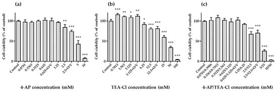Cytotoxicity of KV channel inhibitors against N2a cells: cytotoxicity of (a) 4-AP, (b) TEA-Cl, (c) mixture of 4-AP and TEA-Cl. +O/V indicates that 31.3 μM O and 3.13 μM V were added to N2a cells with KV channel inhibitors. Data are the mean ± standard deviation (SD) of triplicate wells. * p < 0.05; ** p < 0.01; *** p < 0.001, significantly different from control.