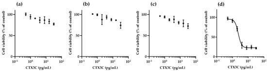 Cytotoxicity curves of CTX3C in the coexistence of O, V, and KV channel inhibitors (low concentration conditions). Data are the mean ± SD of triplicate wells.