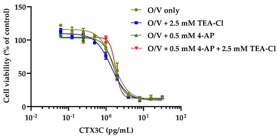 Since the KV channel inhibitors alone did not increase the sensitivity of CTX3C to N2a cells in contrast to O/V, the effects of the KV channel inhibitors were examined in the presence of 31.3/3.13 μM O/V. When comparing the dose–response curves for CTX3C at concentrations of KV channel inhibitors that induced little cell death, all curves with KV channel inhibitors almost overlapped with the O/V-only curve (Figure 3).