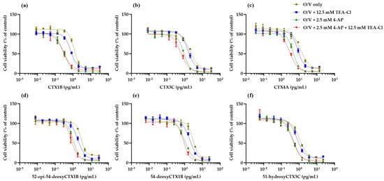 Cytotoxicity curves of CTX congeners in O/V alone and in the coexistence of O/V and KV channel inhibitors (high concentration conditions): (a) CTX1B, (b) CTX3C, (c) CTX4A, (d) 52-epi-54-deoxyCTX1B, (e) 54-deoxyCTX1B, (f) 51-hydroxyCTX3C. Data are the mean ± SD of triplicate wells.