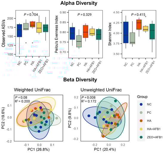 Alpha and beta diversities of the cecal microbiota among different experimental treatments. The cecal contents (n = 7/treatment) were subjected to 16S rRNA gene sequencing. Observed ASV, Pielou’s Evenness, and Shannon Index were calculated to measure the α-diversity of the cecal microbiota; Kruskal-Wallis test was used for statistical significance determination. The β-diversity-weighted UniFrac and unweighted UniFrac distances were used to generate the principal coordinates analysis (PCoA) plots. Permutational multivariate analysis of variance (PERMANOVA) was used for statistical significance determination. NC—negative control; PC—positive control (basal diet + 250 ng AFB1/g); HA—humic acids (basal diet + 0.25% HA); HA + AFB1(basal diet + 0.25% HA + 250 ng AFB1/g); ZEO—Zeolite (basal diet + 0.25% ZEO + 250 ng AFB1/g).