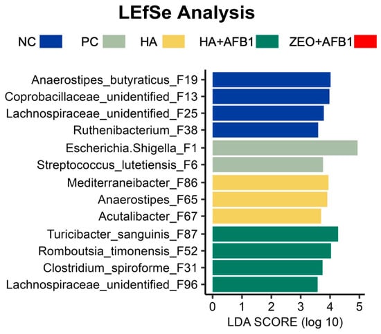 Differential enrichment of bacterial ASV between different experimental treatments (n = 7/treatment) was determined using linear discriminant analysis (LDA) effect size (LEfSe), with the all-against-all multiclass analysis, p < 0.05, and a logarithmic LDA threshold of 3.0. NC—negative control; PC—positive control (basal diet + 250 ng AFB1/g); HA—humic acids (basal diet + 0.25% HA); HA + AFB1(basal diet + 0.25% HA + 250 ng AFB1/g); ZEO—Zeolite (basal diet + 0.25% ZEO + 250 ng AFB1/g).