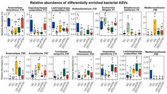 Relative abundances of differentially enriched bacterial ASV (n = 7/treatment). Significance was calculated using Kruskal–Wallis test. a,b,c Indicates significant differences between the treatments (p < 0.05). NC—negative control; PC—positive control (basal diet + 250 ng AFB1/g); HA—humic acids (basal diet + 0.25% HA); HA + AFB1 (basal diet + 0.25% HA + 250 ng AFB1/g); ZEO—Zeolite (basal diet + 0.25% ZEO + 250 ng AFB1/g).