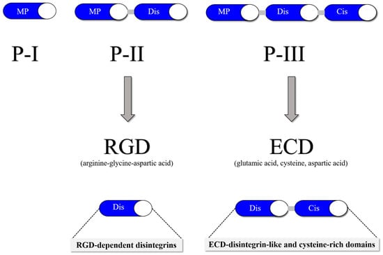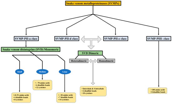 SVMP classification is divided into three classes: P-I (20–30 kDa), which in its mature form contains a metalloproteinase domain; P-II (30–60 kDa), which contains a disintegrin domain linked to the C-terminus of the metalloproteinase domain; and P-III (60–100 kDa), which consists of a metalloproteinase domain, a disintegrin-like domain and a cysteine-rich domain.