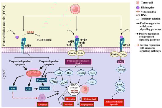 A chimeric recombinant disintegrin called Vicrostatin (VCN) has been used in a number of preclinical studies in various tumor models. VCN is a monomer prepared by recombinant modification of the primary Contortrostatin sequence by replacing the C-terminal tail with 6 aa derived from the C-terminus of Echistatin. It retained the targeting of Contortrostatin to αIIbβ3-, α5β1, αvβ3, and αvβ5 integrins but additionally showed more than 10-fold higher affinity for α5β1-integrin. Compared with the homodimeric structure of contortrostatin, the novel chimeric disintegrin VCN was active as a monomer, which allowed its production in larger amounts than several other cloned and expressed disintegrins. Like Contortrostatin, VCN has been shown to inhibit tumor cell adhesion, endothelial and tumor cell invasion, and angiogenesis. This chimeric recombinant toxin has shown promising results in preclinical experimental models of breast cancer, prostate cancer, ovarian cancer and glioblastoma [23]. Figure 3 shows the intracellular reactions that take place when disintegrins bind to integrin targets, as illustrated in the current literature. The involvement of α5β1-, αVβ3-, α1β1-, α2β1-, α4β1-, and α5β1-integrins in survival, proliferation, infiltration, motility, cytoskeletal reorganization, angiogenesis, apoptosis, and interaction with snake venom disintegrins triggers the onset of these mechanisms in cancer cells [81].