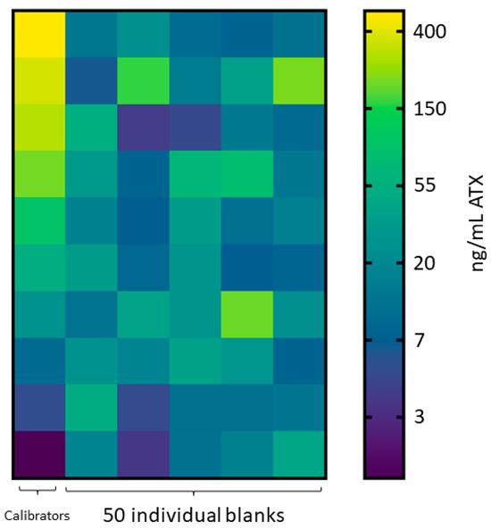 Duplicate calibration curves for dhATX were prepared alongside duplicate ATX calibration curves at the following concentrations: 0, 5, 10, 50, 100, 200, 300, 400, and 500 ng/mL. Cross reactivity was assessed in both water (PBS) and pooled human urine matrix. Following calibrator and sample preparation and plating procedures as outlined above, absorbances were immediately read at 450 nm, and concentrations were calculated using Gen5 software. Subsequent analysis was run in GraphPad Prism (Boston, MA, USA), where IC50s were generated and cross-reactivities calculated. Cross-reactivity of each analyte was calculated with respect to ATX (percent cross-reactivity = (IC50 (half-maximal inhibitory concentration) ATX/IC50 Analyte) × 100) [47].