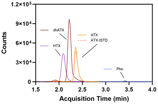 While developing this method, we overcame several complications when detecting ATXs in urine. The first and most common problem is chromatographically separating ATX from Phe in urine [46]. Phe presents a common source of interference in urine due to the similar molecular weights of ATX (165.23 m/z) and Phe (165.19 m/z), which may not be distinguished with low resolution mass spectrometry, which is used here. In the literature, both reverse phase and HILIC columns have been used in methods detecting ATX; however, reverse phase chromatography is more likely to elute ATX and Phe at similar times [46]. Therefore, HILIC chromatography was selected to separate ATX from Phe by over 60 s while also including dhATX and HTX in the chromatography (Figure 6). To further confirm the differentiation between ATX and Phe, our method includes an isotopically labeled ATX-ISTD, which ensured correct selection of the ATX peak during method development. Continued separation of ATX and Phe was confirmed with an instrument function check before each analysis. HTX was not included in our validation due to lack of a reliably available commercial standard.