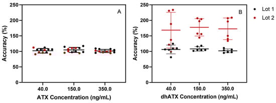 Method accuracy across two separate human urine pools fortified with ATX (A) or dhATX (B) at three concentrations (40, 150, and 350 ng/mL), run in triplicate over two days of testing (n = 6).