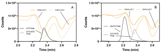 Comparison of (A) ATX and ATX-ISTD and (B) dhATX and ATX-ISTD ionization in two pooled human urine lots. High ionization suppression occurs during the elution of ATX (black line) and ATX-ISTD (dotted black line), shown as representative chromatograms, in both urine pools (A). Slight ionization enhancement for occurs during the elution of dhATX (black line), shown as a representative chromatogram, in both urine pools, while high ionization suppression occurs during the elution of ATX-ISTD (dotted black line), shown as representative chromatogram (B).