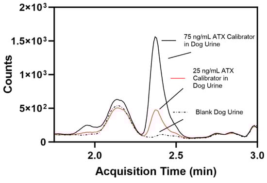ATX fortified in dog blank urine were run alongside human urine calibrators to determine if this method could be used for dog urine samples, and resulted in accuracies ranging from 101 to 108% and precision ranging from 5.23 to 8.31% (Table 2). The fortified dog urine samples were processed as unknown samples using the calibrators prepared in pooled human urine. A comparison of blank dog urine and 25 ng/mL and 75 ng/mL ATX-fortified dog urine show suppression due to matrix effects (Figure 6). ATX LOD and LOQ in dog urine were determined to be 7.41 and 24.7 ng/mL, respectively, using the Taylor method for calculating LOD [42]. dhATX was detected in each sample indicating positive exposure.