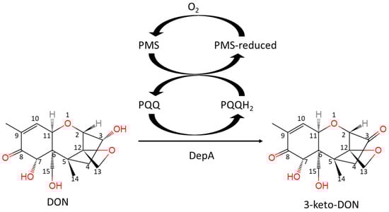 Current chemical and physical methods are insufficient for reducing trichothecene levels in grains and feed; however, employing microorganisms and their enzymes for biological detoxification offers a more promising strategy [4]. Unearthing and exploiting DON detoxification microorganisms and enzymes continues to be an active area of mycotoxin research. The identification of the DON degrading strain Devosia mutans 17-2-E-8 and its associated enzymes DepA and DepB holds promise for future industrial applications. During epimerization, the C3-OH of DON is oxidized by DepA, a Type I PQQ-dependent alcohol dehydrogenase (Figure 1). This produces the less toxic intermediate 3-keto-DON, which is stereo-specifically reduced to 3-epi-DON by the second enzyme DepB [5].