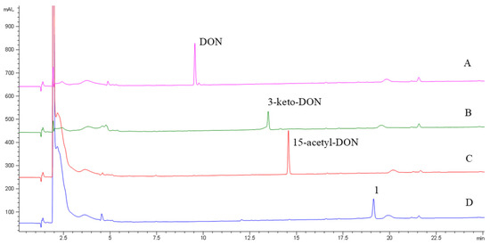 HPLC-DAD chromatograms of DON (A), 15-acetyl-DON (C) and their transformation products of 3-keto-DON (B) and compound 1 (D) after treatment via the DepA system.
