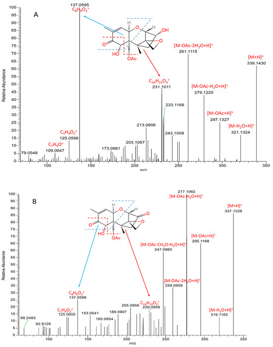 MS/MS spectra of 15-acetyl-DON (A) and its biotransformation product (compound 1) (B) after treatment via the DepA system.