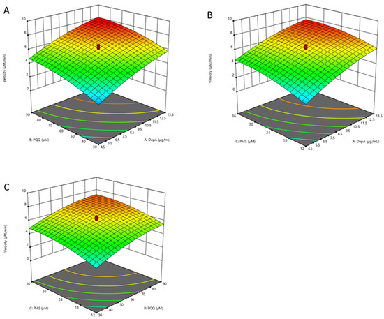 Three-dimensional response surfaces and counter plots illustrating the combined effects of DepA (4.5–13.5 µg·mL−1), PQQ (30–90 µM), and PMS (12–36 µM) on the biotransformation rate of DON in the DepA system: (A) concentration of DepA and PQQ; (B) concentrations of DepA and PMS; (C) concentrations of PQQ and PMS.