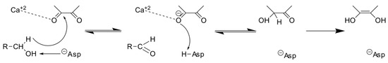 The hydride transfer mechanism of PQQ-dependent dehydrogenases [13]. The hydride-donating carbon atom and PQQ C5 atom are in proximity. Meanwhile, the hydroxyl is in the hydrogen bond range of the catalytic base.