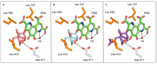 The most optimal docking configuration for DON has a free binding energy of −7.6 kcal/mol, where the proximity is close enough to facilitate hydrogen bond formation between the C3 hydroxyl and catalytic aspartate residue (Figure 8A). The C3 atom is axially positioned within a distance of 3.8 Å to the PQQ C5 atom, allowing for efficient hydride transfer.