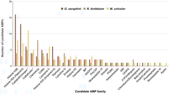 As shown in Figure 3, the number of candidate AMPs is quite variable among the different protein (sub)families. For example, in G. seraphini, the higher number of some histone-derived AMPs (H2B, H2A-hipposin, H2A-acipensin 6) is noteworthy, which are followed by cofilin and lysozyme C. M. unicolor follows a similar pattern regarding the high numbers of histone H2B and H2A-hipposin (although followed by lysozyme C). In contrast, R. bivittatum has a remarkably high number of chemokines. The number of cathelicidins and cystatin-related AMPs (derived from UniProt data) are not directly comparable with the rest of the candidate AMPs (derived from APD3 data) because the specific region that might present antimicrobial activity is not annotated in the UniProt records employed for these three protein families, and therefore the entire protein sequence length was employed. Note that the information shown in Figure 3 is based exclusively on genome-derived data (which is available for only three caecilian species: R. bivittatum, M. unicolor, and G. seraphini) in order to provide a more standardized comparison of AMP numbers among species.