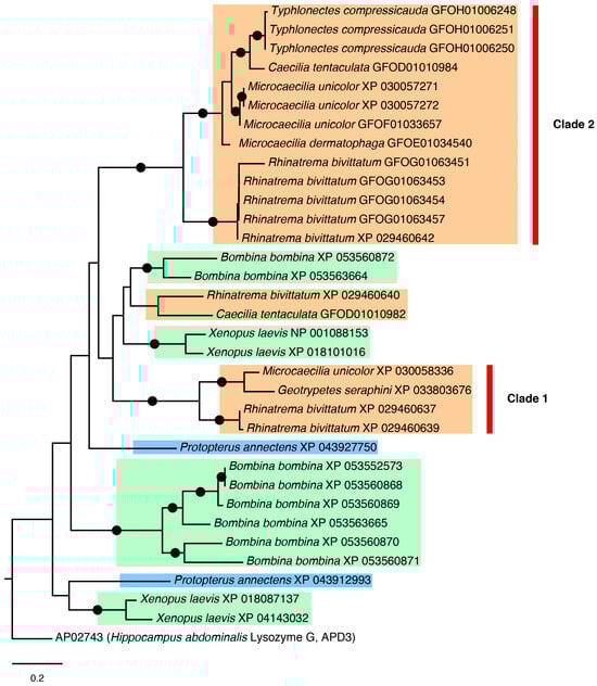 ML phylogeny of lysozyme G sequences using best-fit WAG + G4 substitution model. Black dots on branches represent support values above 80% and 95% for SH-aLRT and UFBoot, respectively. Clades 1 and 2 discussed in the text are indicated with red bars. Colour highlights of species names are as follows: orange for caecilians, green for anurans, and blue for the lungfish.