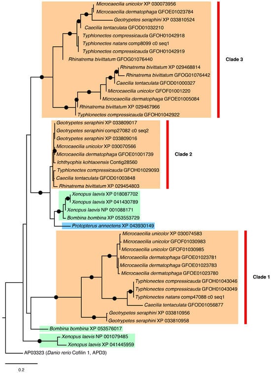 ML phylogeny of cofilin sequences using best-fit LG + G4 substitution model. Black dots on branches represent support values above 80% and 95% for SH-aLRT and UFBoot, respectively. Clades 1, 2, and 3 discussed in the text are indicated with red bars. Colour highlights of species names are as follows: orange for caecilians, green for anurans, and blue for the lungfish.