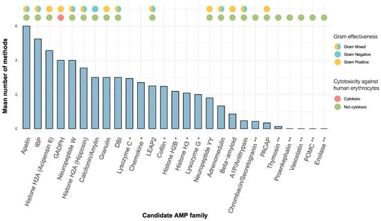 Summary of the predicted antimicrobial characteristics of the candidate caecilian AMPs catalogued in this study. The Y-axis shows the mean number of different activity prediction methods that indicate antimicrobial capacity in the peptides analysed. Effectiveness against Gram-positive and/or Gram-negative bacteria and cytotoxic activity against human erythrocytes is shown as colour circles above each bar. Candidate AMPs marked with an asterisk (*) are peptides for which neither Gram effectiveness nor cytotoxicity could be calculated because they are >100 amino acids in length and they were not classified as AMPs by the AMP Scanner method. Those candidate AMPs marked with two asterisks (**) are peptides for which only Gram effectiveness could not be calculated (not classified as AMPs by the AMP Scanner method).