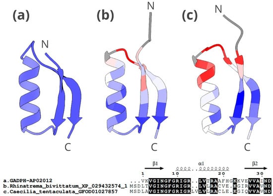 The 3D structure and alignment of GADPH-derived AMPs for R. bivittatum and C. tentaculata. The upper part of the figure shows: (a) peptide from APD3 (antimicrobial activity validated), (b) caecilian candidate AMP with high antimicrobial potential based on in silico predictive analyses (R. bivittatum), (c) caecilian candidate AMP with low antimicrobial potential based on in silico predictive analyses (C. tentaculata). The latter two follow a colour scale ranging from blue (highest similarity) to red (lowest similarity) related to the c-α atom deviation (RMSD) with respect to APD3 AMP. The N-terminus and C-terminus ends are marked with an N and a C, respectively. The lower part of the figure shows the alignment of the three peptides analysed. The conserved regions in the three peptides are highlighted in black. The structural motifs are shown above the alignment.