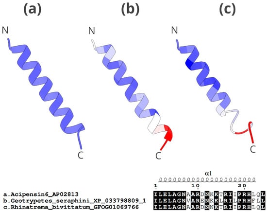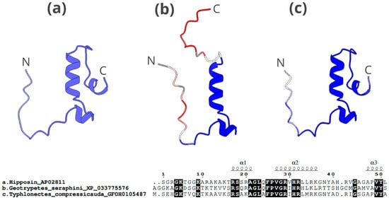The 3D structure of the histone H2A-hipposin (Figure 10) contains a short α-helix at approximately one third of the sequence, followed by a longer α-helix and another short α-helix close to the C-terminus. The peptide with predicted good antimicrobial activity (G. seraphini, b in Figure 10) lacks the C-terminal α-helix. Conversely, the peptide with a low score in the antimicrobial prediction (that of T. compressicauda, c in Figure 10) is remarkably similar in structure to the H2A-hipposin in the APD3 database.