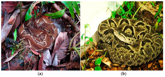 Between 50 and 80% of snake bite accidents in Colombia are recorded under the name Bothrops asper [4] (Figure 1a) due to its distribution in the country and its high reactivity to disturbance by humans; however, there are two or more species with similar morphological characteristics with which it can be confused. One of these is Bothrops rhombeatus (Figure 1b) [5], located in the Andean region of Colombia, and given that until recently the composition of its venom was unknown, it is not possible to predict the similarity or variation in the presentation of the clinical picture concerning the other species of the genus Bothrops. Additionally, Bothrops atrox is one of the species from the Bothrops genus more common in the country, so it is easily confused with B. asper. The intraspecific variability in snake venom resulting in the variability in the patient’s syndromic presentation deserves special consideration because the treatment and clinical management are highly specific and personalized [6].