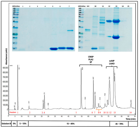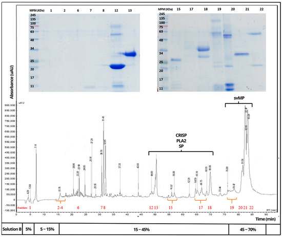 Venoms of B. rhombeatus (Figure 4), B. asper (Figure 5), and B. atrox (Figure 6) were analyzed by reverse-phase HPLC fractionation and SDS-PAGE following the suggestions from researchers considering the protein characterization of the Viperidae family and specifically the Bothrops genus in Latin America [15,16], and because of the previous analysis of a large diversity of viperid venoms, rapid comparison of toxin profiles and classification of chromatographic fractions into protein families was possible without the need for extensive structural characterization [6].