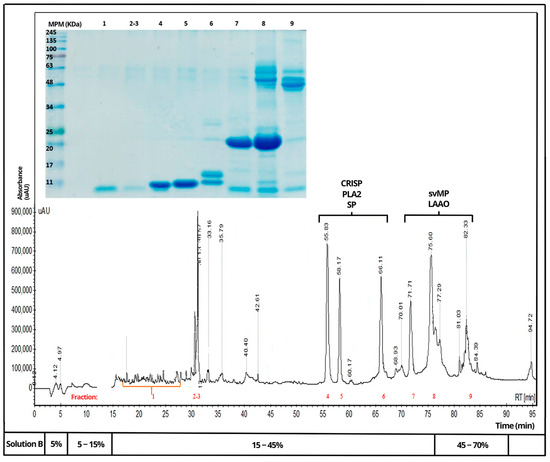 Reverse-phase HPLC separation of the venom proteins from Bothrops asper. Insert: SDS–PAGE of the isolated chromatographic fractions run under non-reducing conditions. (Red numbers represent the fractions selected for SDS—PAGE and affinity chromatography).