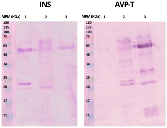 Under reducing conditions, INS antivenom showed conspicuous protein bands between 48 and 70 kDa and bands of lower intensity between 25 and 30 kDa; in addition, a band at 70 kDa and another around 170 kDa indicated the presence of high-molecular-weight aggregates [14], while, under non-reducing conditions, INS antivenom showed a band of 180 kDa. The AVP-T antivenom showed a large band between 20 and 30 kDa and two other bands of lower intensity at 63 and 75 kDa under reducing conditions (Figure 2).