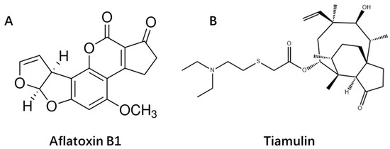 The chemical structure of aflatoxin B1 (A) and Tiamulin (B).