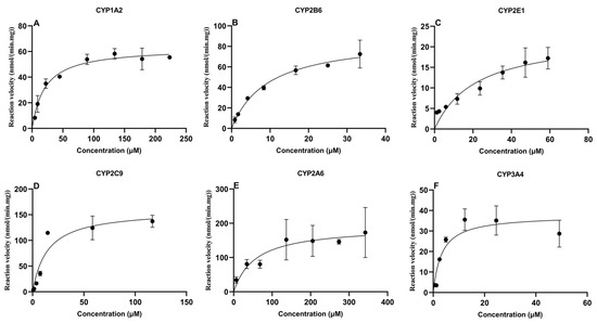 Michaelis-Menten plots of six CYP450 probes in chicken liver microsomes (mean ± SD, n = 3): (A) phenacetin; (B) bupropion; (C) chlorzoxazone; (D) tolbutamide; (E) coumarin; and (F) midazolam.