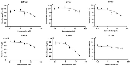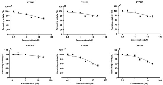 In vitro inhibitory effect of tiamulin on cytochrome CYP450 isoforms in chicken liver microsomes (mean ± SD, n = 3): (A) CYP1A2; (B) CYP2B6; (C) CYP2E1; (D) CYP2C9; (E) CYP2A6; and (F) CYP3A4.
