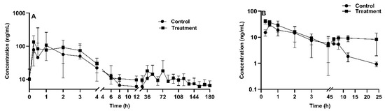 Tiamulin plasma concentration-time profile after oral administration in chickens (n = 8 in the treatment group, n = 9 in the control group) with (treatment) or without (control) aflatoxin B1 contaminated diet (20 µg/kg feed for 2 weeks) (A); aflatoxin B1 plasma concentration-time profile after oral administration in chickens (n = 4 in each group) with (treatment) or without (control) tiamulin oral gavage administration (25 mg/kg BW for 4 days) (B). The mean ± SD is shown.