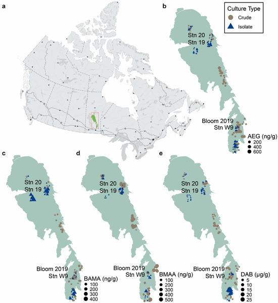 Concentration profiles and distribution of non-protein amino acids in Lake Winnipeg. (a) Lake Winnipeg (highlighted in the red box) is located in Manitoba, Canada. (b) N-(2-aminoethyl)glycine (AEG); (c) β-aminomethyl-L-alanine (BAMA); (d) β-N-methylamino-L-alanine (BMAA); and (e) 2,4-diaminobutyric acid (DAB) concentrations in crude (brown; n = 27 samples with 3 technical replicates) and isolate (blue; n = 16 samples with 4 technical replicates) cultures. Original field samples were collected between 2016 and 2021. Stations containing paired crude and isolate cultures from the same original field sample are shown on each map. Canada map outline adapted from the Atlas of Canada, Natural Resources Canada, and Lake Winnipeg outline adapted from the University of Manitoba Centre for Earth Observation Science.