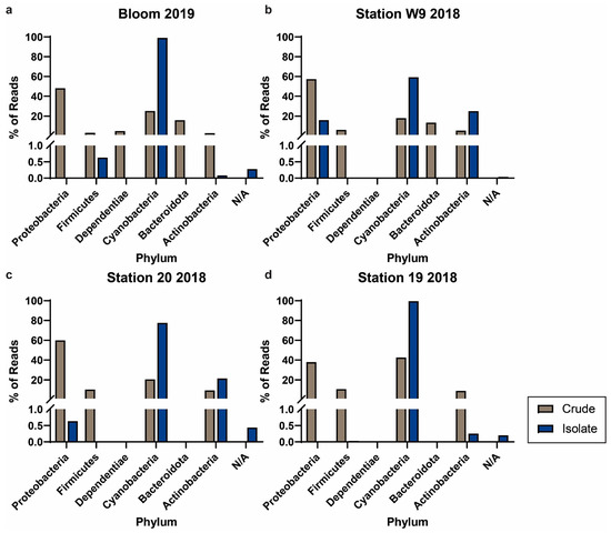 Phylum breakdown of paired crude (brown) and isolate (blue) samples from the same parent field samples. Cultures were established from locations and years (a) Bloom 2019, (b) Station W9 2018, (c) Station 20 2018, and (d) Station 19 2018. Cultures shown in (a) and (b) were putatively identified as containing identical cyanobacterial species.